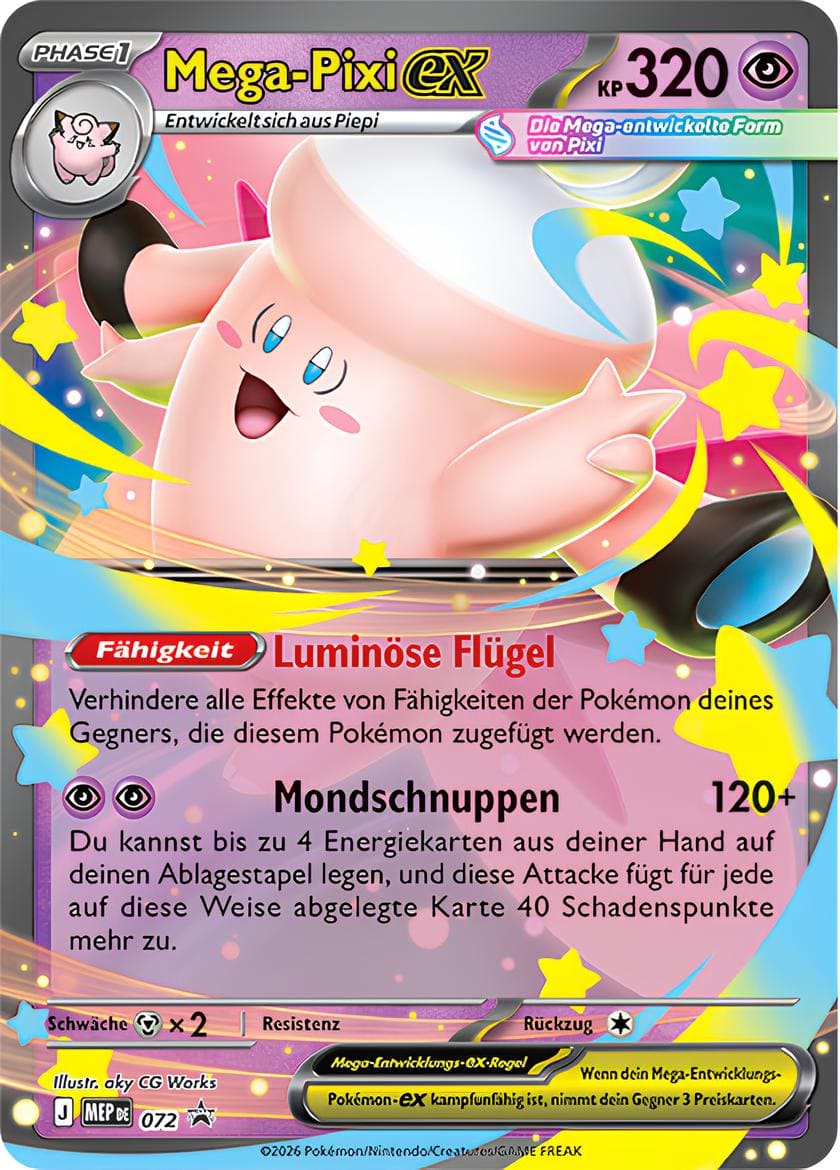 Die Promokarten sind alternative Nachdrucke von Mega-Pixi-ex aus Optimale Ordnung sowie Mega-Gengar-ex aus Erhabene Helden mit bisher unveröffentlichten Illustrationen.