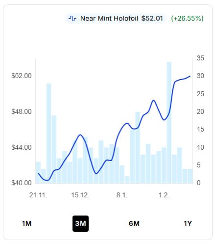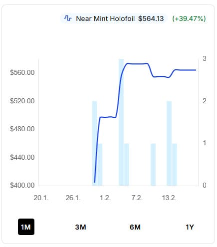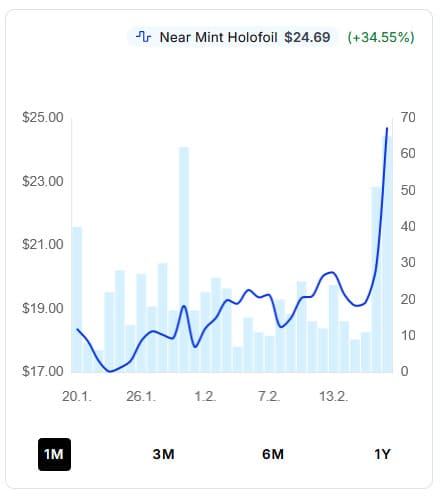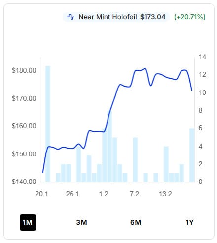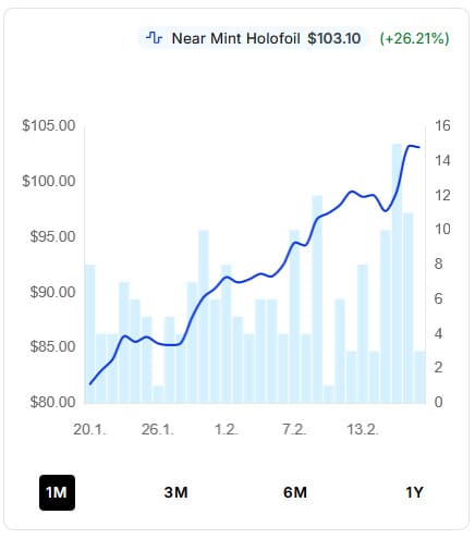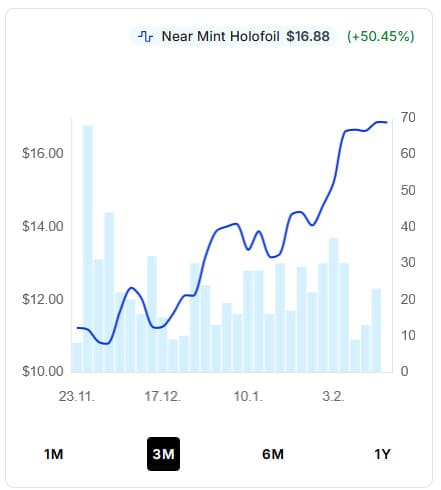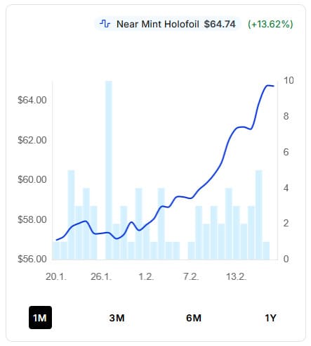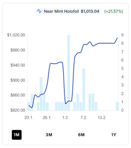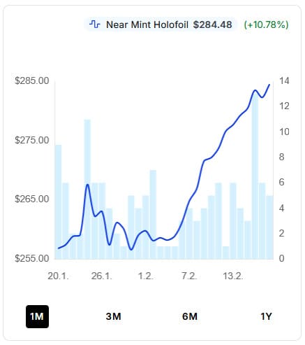 Das schlafende Raichu aus der Erweiterung Entwicklungen in Paldea befindet sich auch in diesem Monat weiterhin im Aufwind. Seine begehrte Illustrationskarte ist im Vergleich zum Januar um mehr als 10 % im Preis gestiegen.