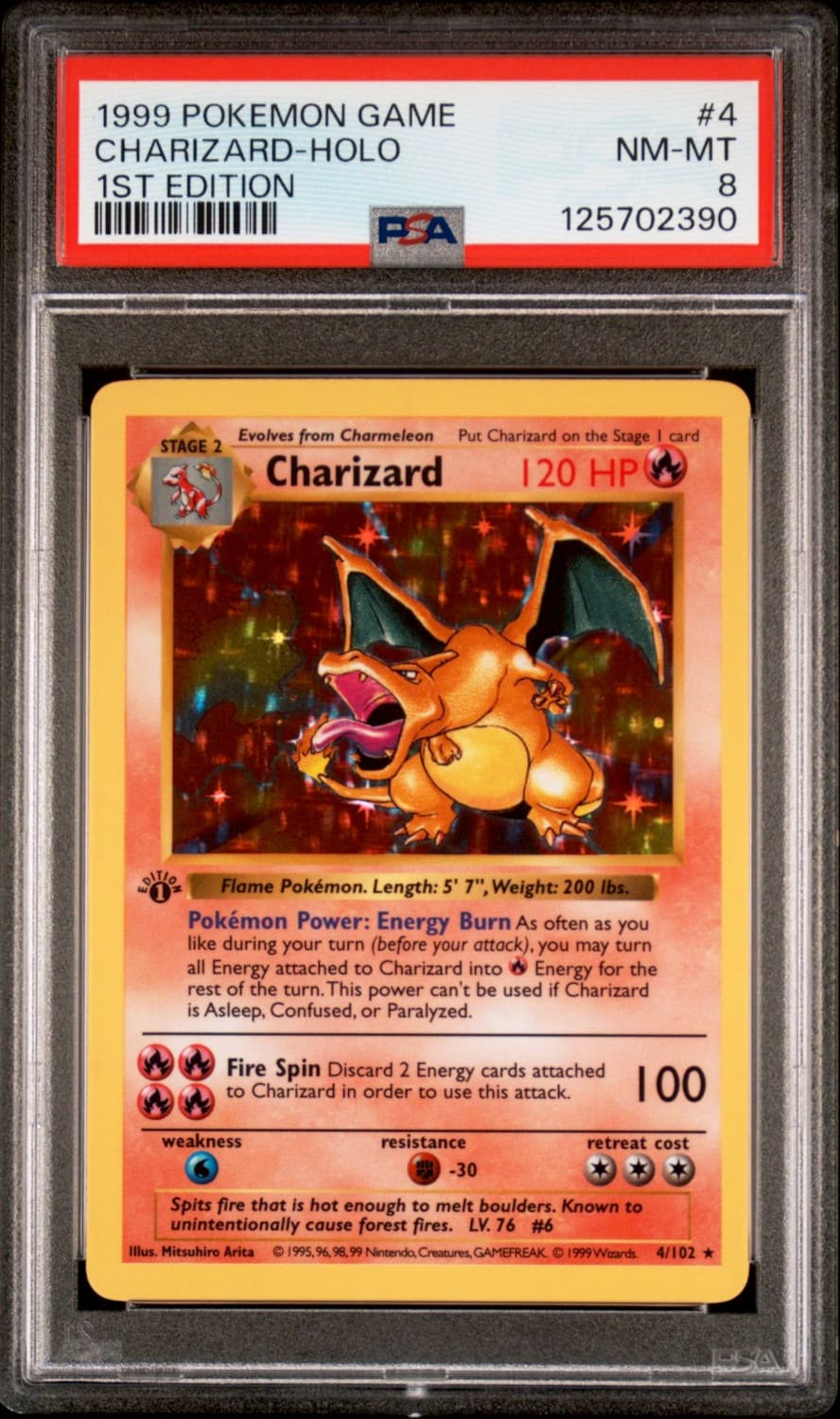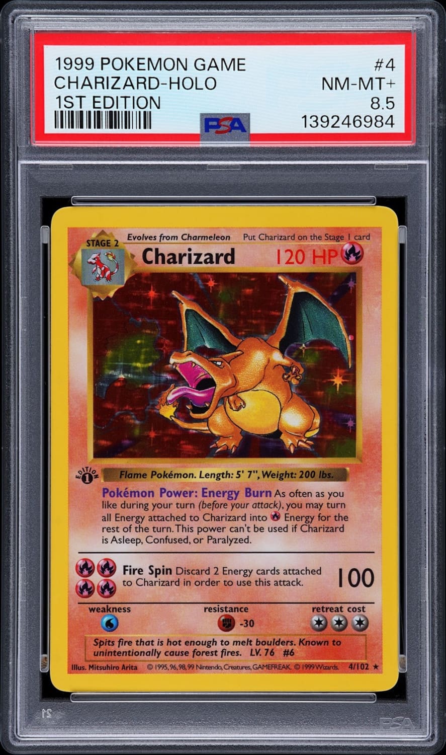 Diese seltene Testdruck-Karte von Glurak wurde bereits im Jahr 1996 veröffentlicht, einige Wochen vor dem japanischen Base Set. Im Gegensatz zur finalen Karte fehlt dem Exemplar die lichtundurchlässige Folie sowohl auf der Vorder- als auch auf der Rückseite. CGC hat zum Zeitpunkt dieses Artikels nur drei Testdruck-Karten von Glurak mit der zweithöchsten Bewertung „Gem Mint 10“ ausgezeichnet. Der aktuelle Marktwert beträgt bis zu 35.000 US-Dollar (ca. 30.200 €).