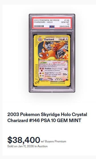 Als eines der mächtigsten legendären Pokémon überhaupt hat sich Lugia über die Jahrzehnte hinweg zu einem echten Fan-Liebling entwickelt. Seinen ersten großen Auftritt hatte es bereits in der zweiten Spielgeneration – auf dem Cover des Kultspiels Pokémon Silber. Besonders gefragt ist die Kristall-Pokémon-Karte von Lugia aus der Erweiterung Aquapolis. Neben ihrer besonderen Fähigkeit „Kristall-Typ“ besticht sie durch ihr funkelndes Design und ihre atemberaubende Illustration. Ein seltenes PSA-10-Exemplar wechselte am 11. Januar 2026 für 36.763 US-Dollar (ca. 31.800 €) den Besitzer.